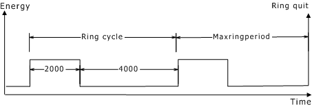 The second characteristic used for broadband tone detection is the signal's cadence. The application specifies tone counts in ADI_CALLPROG_PARMS. The signal must satisfy the single tone criteria described in the following illustration for the respective number of cycles before the ADI service concludes the signal is present. The following table defines the cadence for each signal: