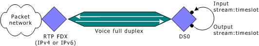 DS0 loopback connections reverse the direction in which voice data flows when the data reaches a DS0 endpoint. Applications use the Switching service to switch the DS0 endpoint's output stream to its input stream and reverse the flow of data back to the connection's RTP IPv4 or IPv6 endpoint. The following illustration shows a DS0 loopback connection: