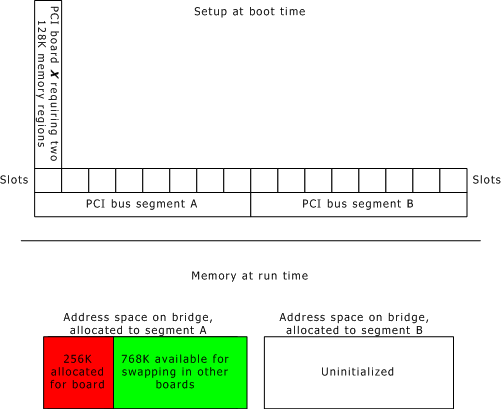 If any devices are physically installed at boot time, the bridge windows are initialized to be just big enough to span the address spaces that have been allocated to these devices behind the bridge. In this case, boards can be hot-inserted only into slots that were populated at boot time. (This is true unless the boards can fit into leftover allocated space, as described below.)