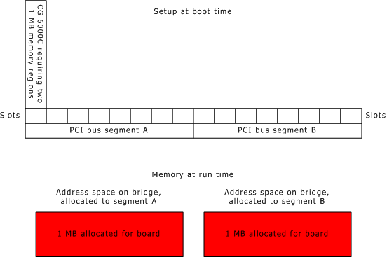 Some boards (such as the CG 6000C board) have an address space requirement of two 1 MB memory regions. Since this requirement exactly matches the 1 MB granularity, you cannot add more of these boards than were present at start-up without rebooting. The following illustration shows a PCI bus with a CG 6000C board inserted: