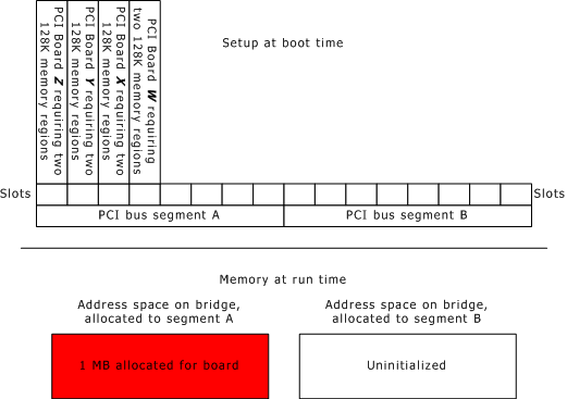 Each device requires a certain amount of address space on the bridges. At boot time, the system BIOS configures address space windows on each bridge to define the range of addresses (that is, the bus number or memory address) that are allocated behind that bridge. The following illustration shows segments and allocated address space on bridge: