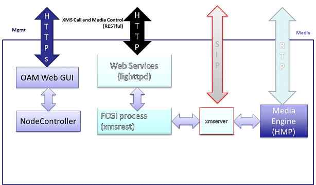 The PowerMedia XMS translates RESTful commands into the PowerMedia HMP media engine's low-level API. The media engine itself handles SIP calls, plays/records multimedia, and mixes multimedia conferences.