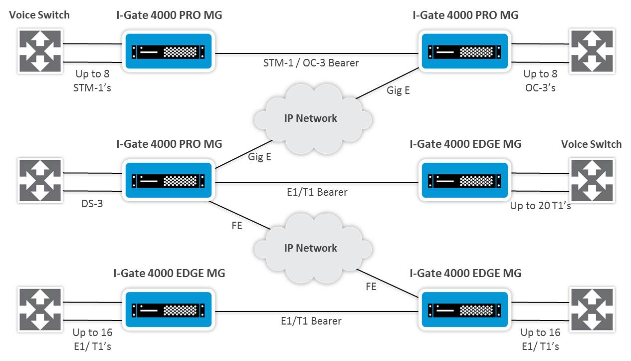 - I-Gate 4000 PRO: Using a modular slot in card approach to facilitate both E1/T1 and STM-1 / OC3 connectivity (up to 8 optical and 192 E1 / T1’s) along with a varying degree of voice compression enabled via DSP resource cards.