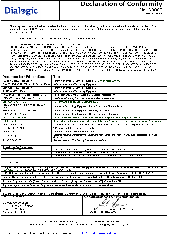 In this section, you can find the European Declarations of Conformity. Refer to the Dialogic web site for the latest copies.