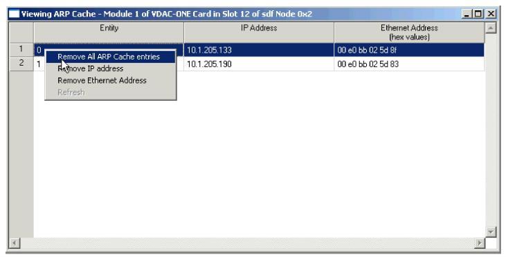 If you choose the Remove all ARP Cache Entries menu, the CSA sends the ARP Cache Query message with the Remove Entries TLV to the node. This message removes all the entries in the ARP Cache table immediately. Usually the Cache is cleared every five minutes by default.