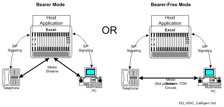 In bearer mode, the RTP stream passes through the VDAC-ONE or IP Network Interface Series 2 card. Bearer-free mode avoids "hairpinning" the call because the RTP stream does not have to pass through the CSP via the VDAC-ONE or IP Network Interface Series 2 card.