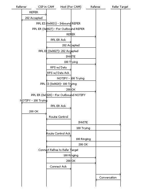 Whenever there is an incoming REFER request, the REFER-TO header is reported to the host in the PPL Event Indication (Event 0x0021; Component 0x00A7). The host can propagate the REFER request to the outbound leg using the PPL Event Request message (Event 0x0027; Component 0x00A7).