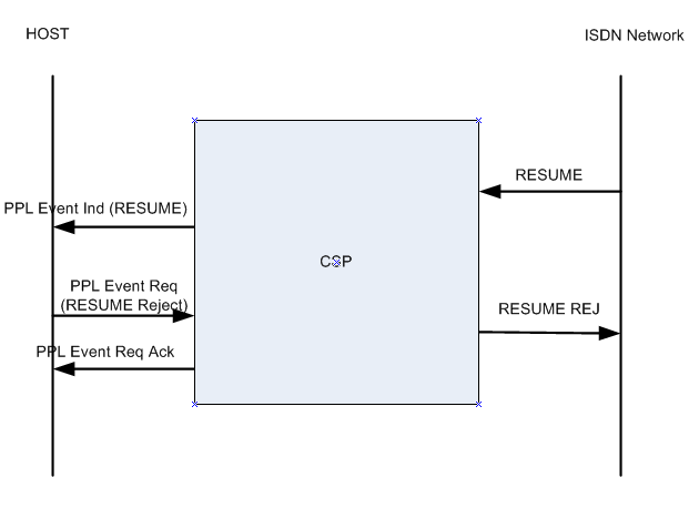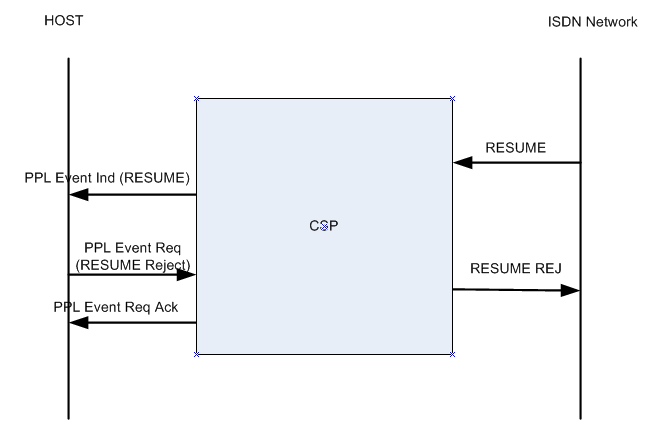 When the ISDN network wishes to resume the call, it will transmit a RESUME message to the CSP. The CSP will send a PPL Event Indication of RESUME to the host. The host will send a PPL Event Request of RESUME ACK or RESUME REJECT to the CSP which will generate the required response to the ISDN network. If the call has been successfully resumed, the CSP will stop the call hold timer, T307.