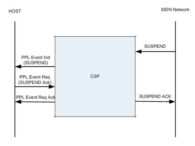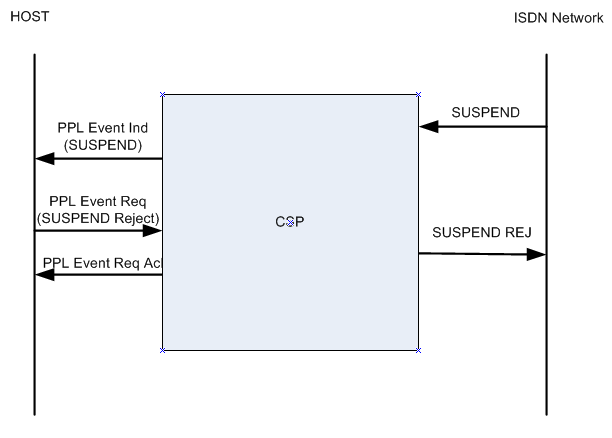 When an ISDN call is set up and the ISDN network wants to put the call on hold, it will transmit a SUSPEND message to the CSP. The CSP will send a PPL Event Indication (0x43) of SUSPEND to the host. The host will send a PPL Event Request (0x44) of SUSPEND ACK or SUSPEND REJECT to the CSP which will generate the required response to the ISDN network.