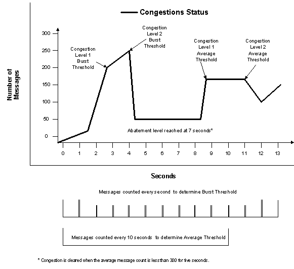 The two pre-defined levels of congestion exist with thresholds defined for each. Congestion Level 1 defines the threshold at which calls are rejected. Congestion Level 2, for the higher level, defines the threshold at which point calls are completely ignored.