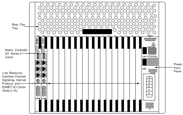 The rear of the chassis has dedicated slots for the CSP Matrix Series 3 I/O cards. Slots 0-15 are for the other I/O cards. The power input panel is also located at the rear of the chassis