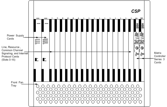 The front of the chassis has dedicated slots for the CSP Matrix Series 3 and Power cards. Slots 0-15 are for the other line cards.