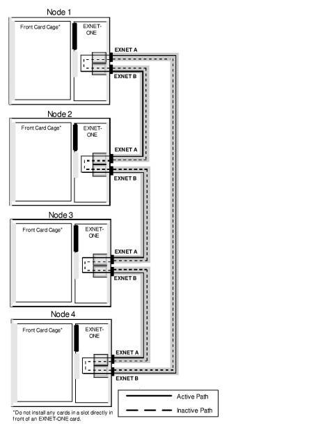 • The node that was connected to the failed node’s EXNET A port loops back its EXNET B port.