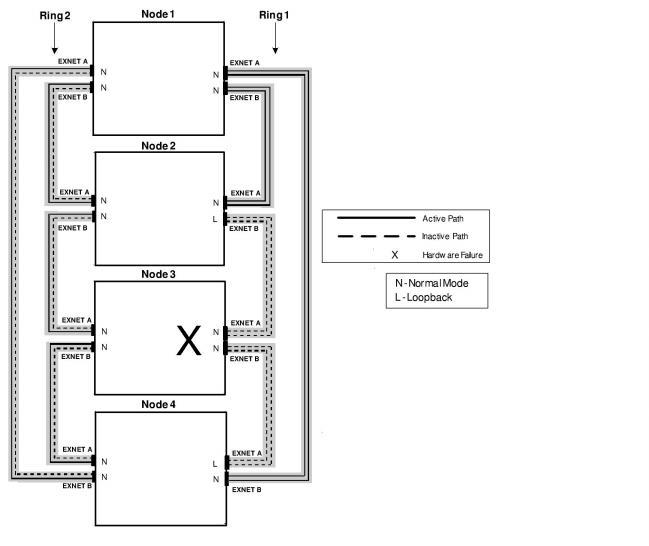 • The node that was connected to the failed node’s EXNET A port (Node 2) loops back its EXNET B port on the affected ring