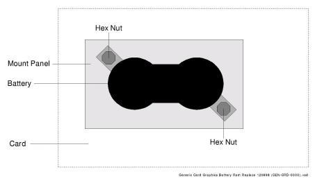 3 Unscrew the two hex nuts holding the battery to the card and remove the battery. If the card has a Mount Panel between the battery and the card, the Mount Panel must remain installed on the card when you install the new battery. See Top View of a RAM Backup Battery Attached to a Card.