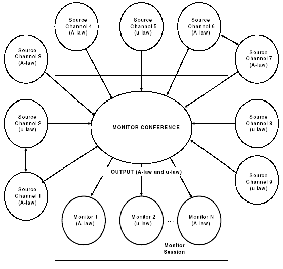 A monitor conference consists of source channels, which are grouped on a DSP conference resource. A monitor session consists of the monitor conference and the monitor channels that are connected to it. You can think of a monitor conference as a mixed conference with listen-only channels. However, the monitor conference is more flexible because:
