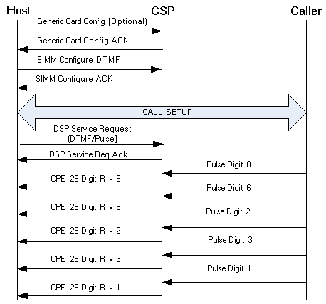 Following this optional configuration, the DSP SIMM Configure (0x00C0) message will enable DTMF/Pulse dialing on the CSP. When the call is setup, a DSP Service Request (0x00BD) message or Collect Digit String (0x00BC) message enables the DSP Series 2 card to begin receiving pulse or DTMF digit indications. In the case of a DSP Service Request, these digits will show up individually, and in the case of collect digit strings, the digits will show up when the requested digit string arrives. Pulse dialing can be canceled using the DSP Service Cancel (0x00BE) message.