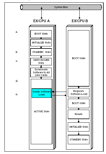 • Card B downloads the system software to all the line cards, enters the Active state, and becomes the active Matrix Controller. Card A enters the standby state and becomes the standby Matrix Controller.