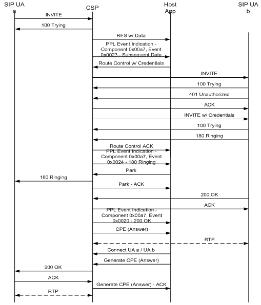 When the CSP receives the PPL Event Request message, the SIP stack will send the 401 Unauthorized response and include the WWW-Authenticate header using the information from the above TLVs. When the INVITE with credentials arrives, the CSP decrypts and validates the credentials and send the PPL Event Request ACK to the host.