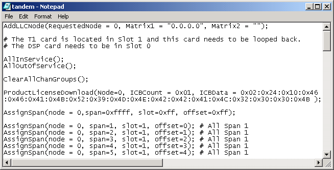 2 In the tandem.cfg file, change the IP address of Matrix1 and enter slot information to correspond with your CSP. If you have a redundant CSP Matrix Series 3 card, add the IP address for this as well. Save the file.