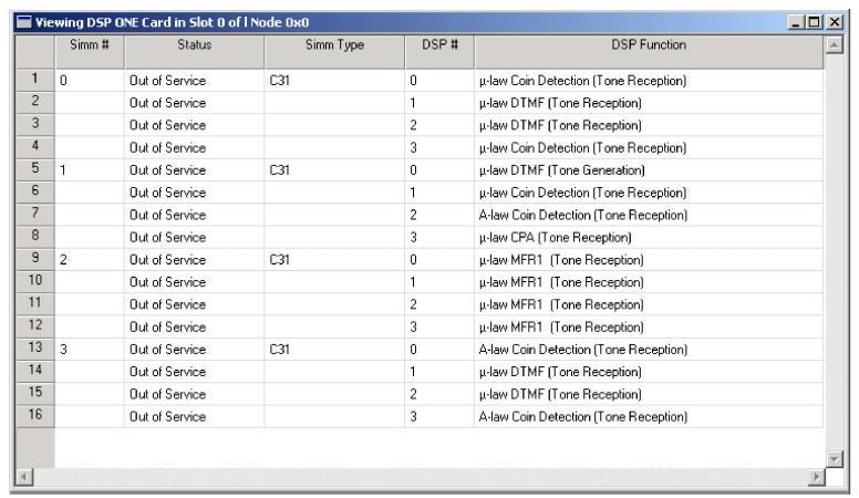 In the DSP card view you see the configured SIMM numbers, Status, SIMM Type, DSP number, and DSP Function.