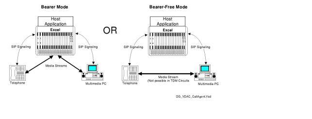 In bearer mode, the RTP stream passes through the VDAC-ONE or IP Network Interface Series 2 card. Bearer-free mode avoids "hairpinning" the call because the RTP stream does not have to pass through the CSP via the VDAC-ONE or IP Network Interface Series 2 card.
