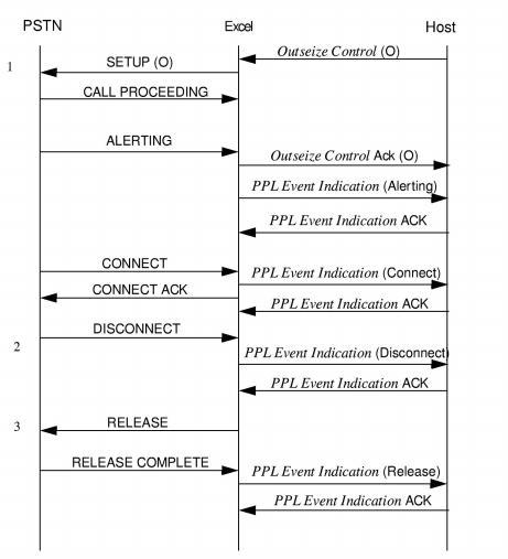 Once the SETUP is sent, the Excel platform waits for a CALL PROCEEDING ACK, or a SETUP ACK. Once the ALERTING, PROGRESS, or CONNECT occurs, the Outseize Control ACK returns to the host. You can send each of these events to the host with the data included using the PPL Event Indication message. Once the ACK is sent, the host performs any of the Layer 4 specific call processing events.