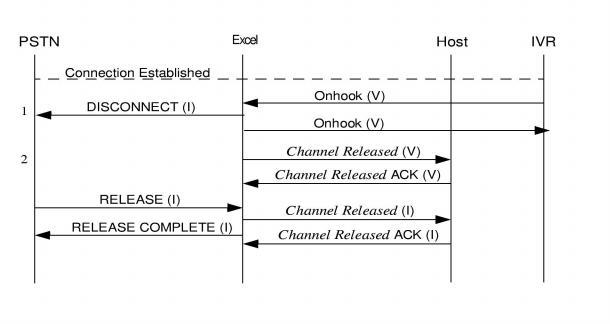 1. If the host had the option of "Channel Release Request on ISDN Disconnect" bit set in the ISDN Interface Configure message, the Channel Release Request message would get sent to the host. Otherwise, the host would not be notified of the call being cleared until receiving the Channel Released message. Also, as shown above, if the host did not have "Distant End Release Mode" or "Local End Release Mode" set to park, the Excel platform would automatically initiate clearing procedures on the channel included in the connection (IVR).