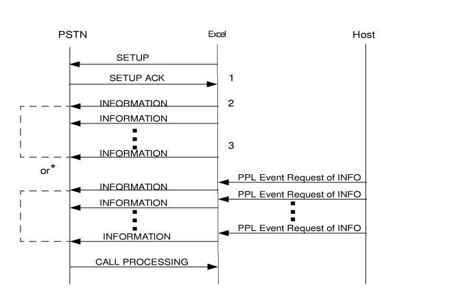 In the first two conditions, the Excel platform sends a CALL PROCEEDING message to the network and a Request For Service With Data message is sent to the host with all of the Called Party digits. When a timeout condition occurs, a 15 second L3 Q.931 timer (T302) is set after the Excel platform sends a SETUP ACK. This timer is reset when each INFORMATION message is received. If this timer expires before the Excel platform receives an INFORMATION message, the incoming call is cleared with a DISCONNECT message.