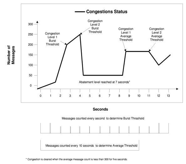The two pre-defined levels of congestion exist with thresholds defined for each. Congestion Level 1 defines the threshold at which calls are rejected. Congestion Level 2, for the higher level, defines the threshold at which point calls are completely ignored.