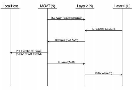 The procedure below shows an ID Request from the user side, requesting TEI 11. Management checks the Configuration database but cannot find TEI 11 listed, so it issues an ID Denied. Management sends a PPL Event Indication message to the local host to indicate that this TEI failed assignment procedures.