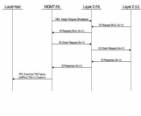 The procedure below shows a check procedure being initiated when a TEI is already assigned. The ID Check Response message returns the same TEI, and the TEI failure is propagated to the host.