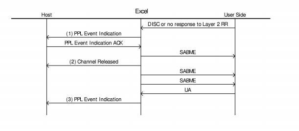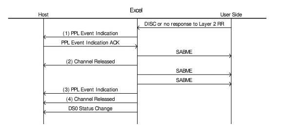 1. On receiving a Layer 2 DISCONNECT, or no response to a Layer 2 RR (T203 expiry), from the user side indicating a D channel failure, the Excel platform sends a PPL event of Network Side D Channel Temporary Malfunction (0x04).