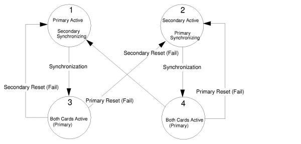 The next figure shows the four states of redundancy and the transition between states due to the resetting of either SS7 card. The host is sent CCS Redundancy Report messages for each of the state transitions shown.