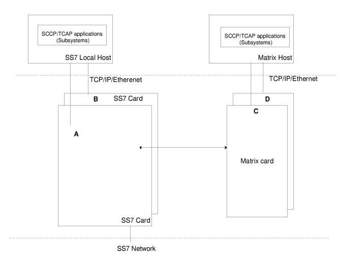 In the next diagram, A, B, C, and D are the host link failure detection points where the host link failure detection logic resides. Host link failure detection is set up as two separate processes: one for an SS7 card and one for a Matrix Controller card.
