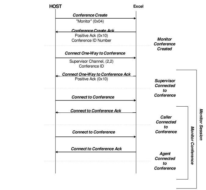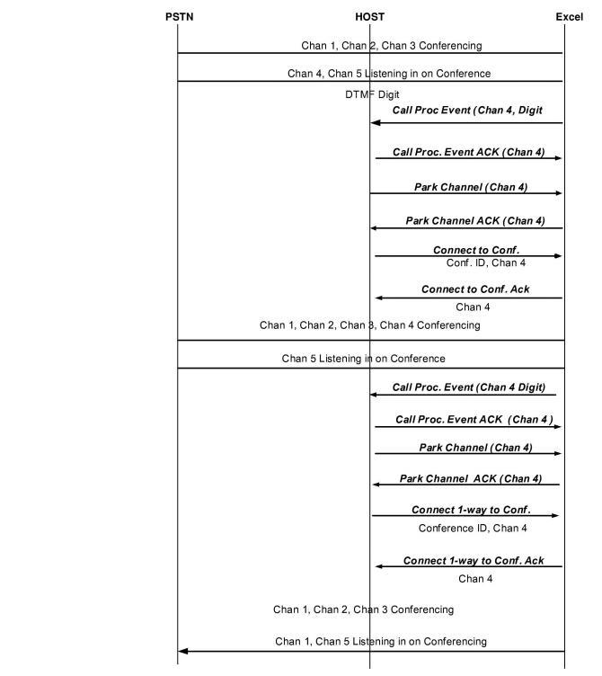 This example shows the API messages transferring a channel from broadcast (listen only) to conference and back again. Dialing "Add Me To Conference" and "Remove Me From Conference" DTMF digit is also shown.