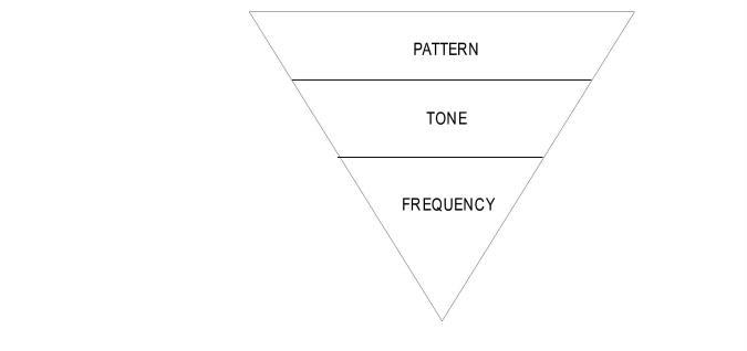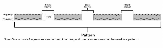 A tone pattern is formed when tones are combined, with specific intervals of silence between them. For example, the industry-standard "call waiting tone" is actually a pattern, in which Tone 1 is on for 300 milliseconds, off for 9700 milliseconds, and on again for 300 milliseconds. You can think of a call progress tone pattern as being at the top of a hierarchy, with tone in the middle and frequency at the bottom. That is, one or more frequencies make up a tone, and one or more tones make up a pattern.
