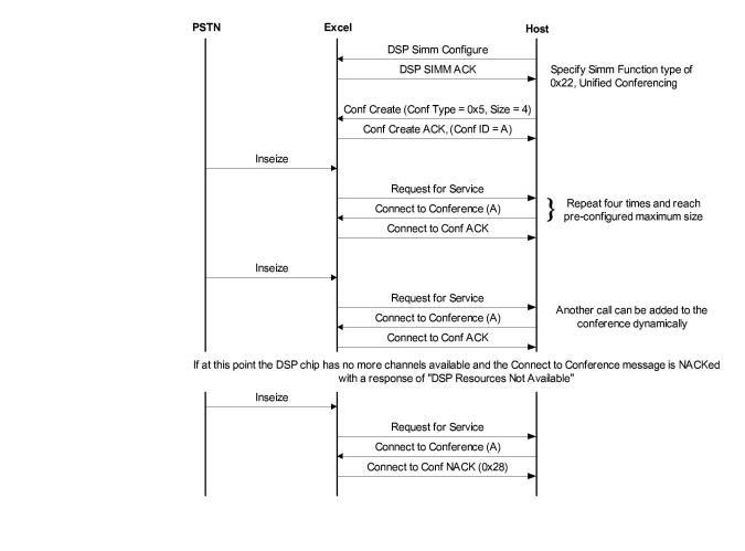 The call flow below illustrates how the host application can configure the Excel platform to use Unified conferencing. It also illustrates how to dynamically increase the size of a conference beyond the number originally specified in the Conference Create (0x004B) message.