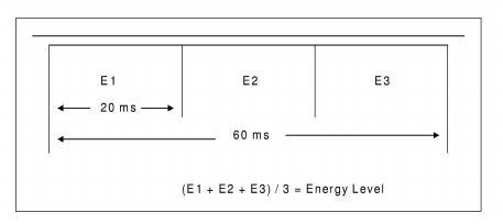 The Energy Detection feature detects energy on a channel. You can use this feature for CPA when there is not a pattern to match available, or to report energy detection to the host application. To compensate for background noise and to filter out short energy bursts, you can set the sensitivity level and the scan duration (defined below).