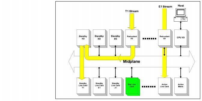 I/O card to connect to the redundant bus. The Redundant I/O card then switches the data stream of the failed line card onto the Redundant Bus. The data stream then passes from the Redundant Bus, through the Standby I/O card, and finally to the standby line card.