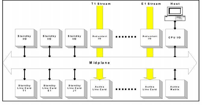 The host then instructs the Matrix Controller to reroute the appropriate T1, E1, or J1 data stream. The Matrix Controller instructs the standby