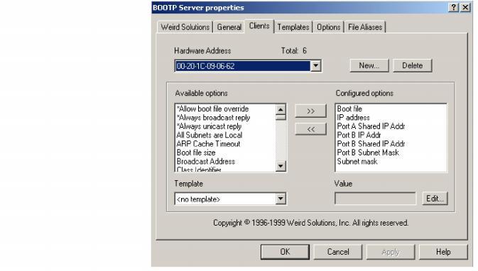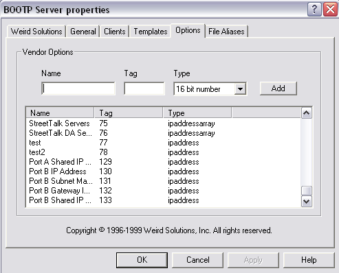 1 Double-click BOOTP Server NT from the Control Panel to display the Weird Solutions BOOTP Server NT dialog box. Select the Options tab.