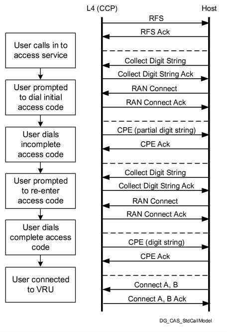 The figure below represents the same call scenario, except that Call Control has been programmed to handle the initial stages of call setup, with no host intervention required. Instead of the eight API messages required in the preceding diagram, only two API messages are required when you use Call Control.