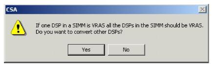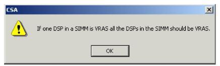 On the DSP-ONE card, SIMM modules zero (0) and two (2) may be populated for a Voice Recorded Announcement System, (VRAS). It is important that the configuration mirror the physical hardware. If configuring VRAS, all DSPs on that SIMM must be configured for VRAS. If you only have one configured when you click Recorded Announcement, the following message pops up: