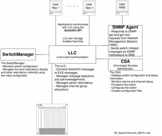 SwitchKit is a software package that consists primarily of four modular components that function on an external host computer. SwitchKit acts as an application server, communicating with all applications and the CSP switch through a Transmission Control Protocol/Internet Protocol (TCP/IP) interface.