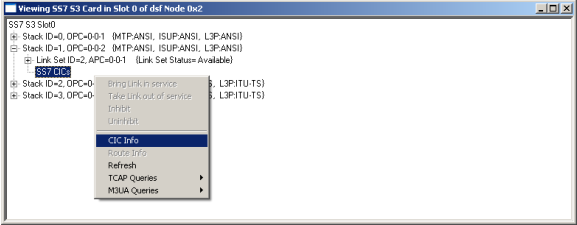 To get more detailed CIC information, from the SS7 card view, either right-click the SS7 CIC, or select the stack of interest and select Provisioning ®SS7® CIC Info.