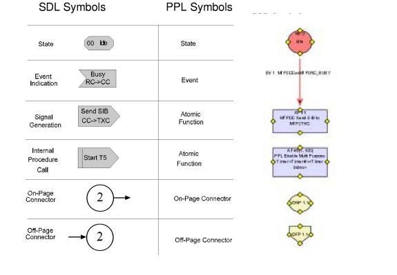 PPL state machines use symbols to represent states, atomic functions, and events. These correspond to standard Specification and Description Language (SDL) symbols as shown in the figure below The PPL symbol for a state that is internal is denoted with an "I" in front of the "S".