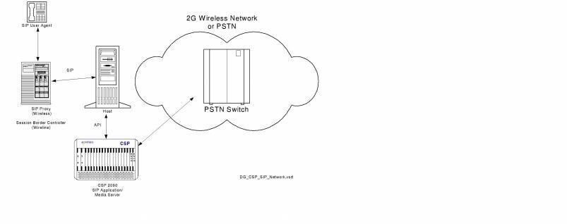 The following diagram shows a SIP based network architecture with the high-level functionality provided by the CSP 2090. The network can be 3G Wireless or Wireline.