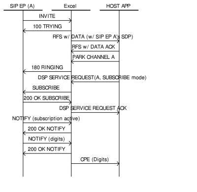 1. When the host issues a DTMF detection request in the DSP Service Request (0x00BD) message for a SIP call, the Excel platform tries to initiate a subscription for telephone events with the remote end point using the SUBSCRIBE method.