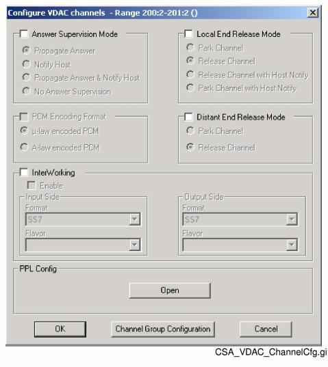 15 In the Channel Group Configuration dialog box, click Open to invoke the Configure VDAC Channels dialog box. The dialog box opens with default values. Note that the Interworking group box refers to routing.